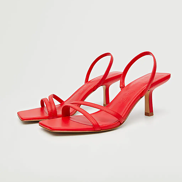 La sandalias que ha llevado son un modelo de la nueva colección de Mango que lo tiene todo para convertirse en una de las más buscadas y vendidas de la temporada. Son unas sandalias de tiras rojas, el color más favorecedor, que llevan doble tira en el empeine, punta cuadrada y tira que rodea el talón para sujetar el calzado al pie. Tiene un tacón fino de cinco centímetros, una altura asequible para muchas con la que se puede ir cómoda y elegante.