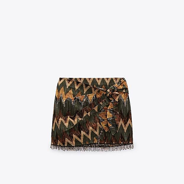 Hablamos de esta falda mini estilo pareo con estampado zig zag en tonos verdes y marrones. Es un diseño con tiro alto. En la parte delantera, el tejido se cruza y cuenta con detalle de nudo. Y, el bajo está decorado con flecos de abalorios.