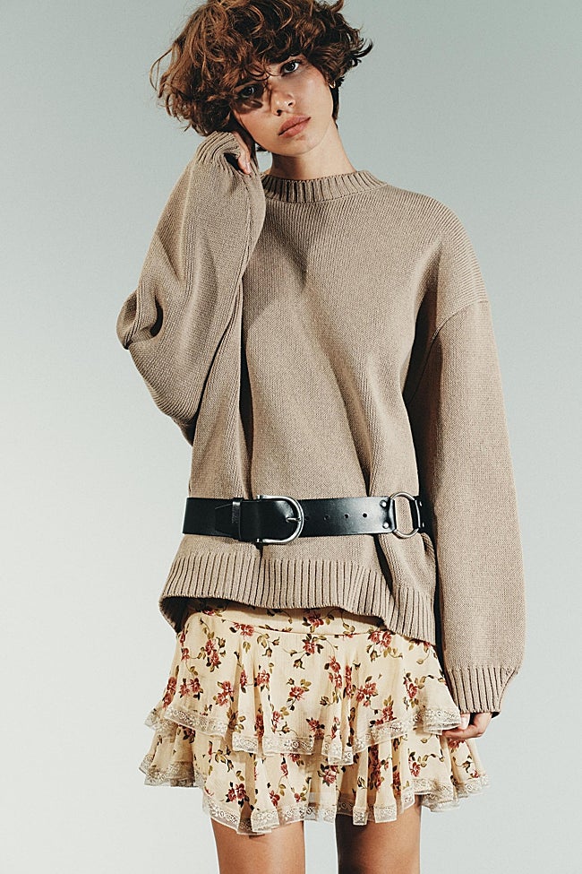 Otra propuesta muy efectiva es combinar estas faldas durante los meses de otoño, es lucirlas con prendas de punto en colores neutros. Un jersey oversize de color beige o negro será el mejor aliado de estas bonitas faldas con estampado de flores. Los accesorios marcarán la diferencia.