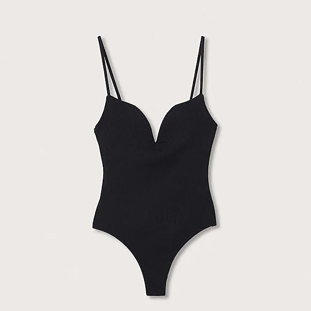 Es un bañador muy sencillo con textura en color negro y tirantes muy finos. Cuenta con un escote en pico y una silueta muy favorecedora. Cuesta 39,99 euros y es uno de los más deseados.
