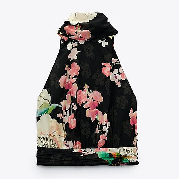 Romántico y moderno, el combo con el que la enseña estrella de Inditex nos ha cautivado está compuesto por un cuerpo de tejido sedoso con cuello halter en tonos negros y con print de flores en gamas rosas.