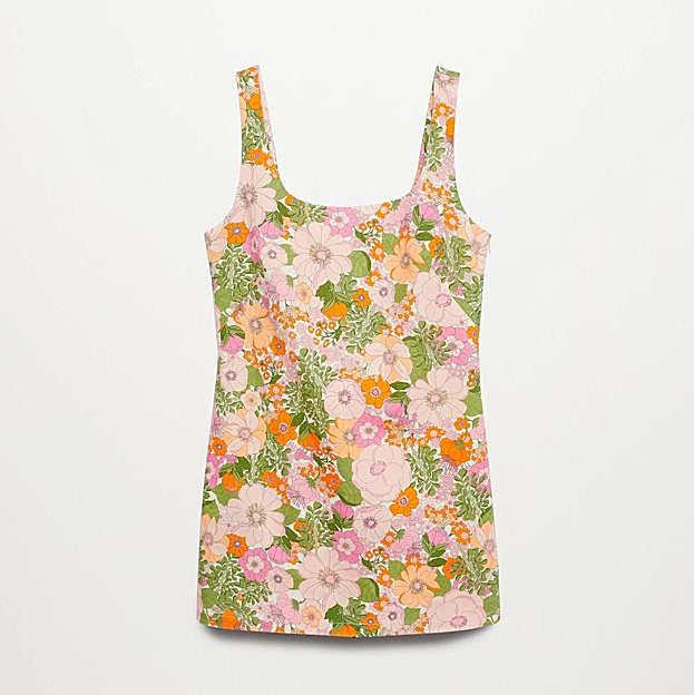 Otra de sus elecciones es un mono corto de estampado floral con efecto rejuvenecedor y que también tiene ese aire vintage que tanto se lleva ahora. La parte delantera del bajo crea la apariencia de que es un mini vestido, pero... ¡No! (trampantojo) Podemos ir seguras y despreocupadas. Con tirantes anchos, escote cuadrado y espalda al aire, en color verde, naranja y rosa, como si imitara a un jardín. No solo es ultra femenino sino que viene genial para el entretiempo si se combina con un cárdigan oversize romántico, en tonos pastel o vibrantes. ¿Su precio? 29,99 euros.