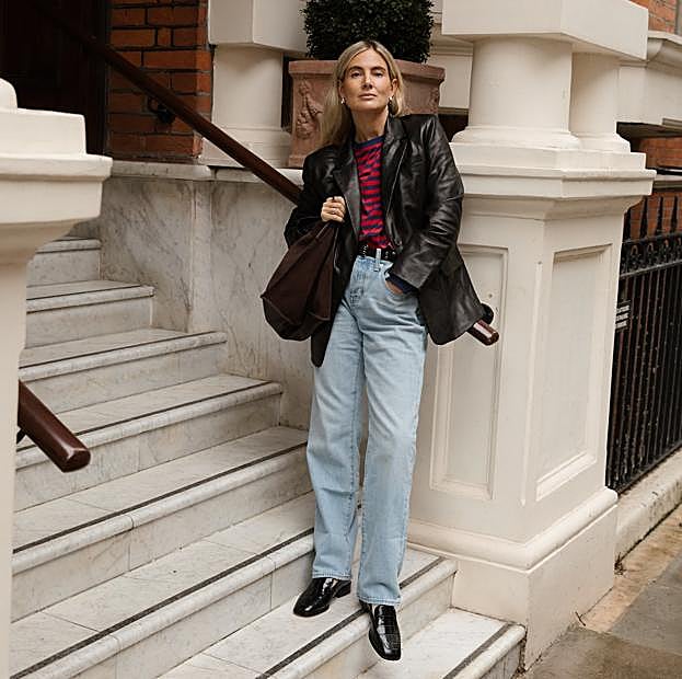 Vaquero, jersey y chupa de cuero. Es un look con aires noventeros que resulta juvenil, ponible y versátil. Si buscas un aire diferente, apuesta por los modelos de jerséis de rayas en colores como hace Lucy. El largo de la chaqueta de piel depende de ti.