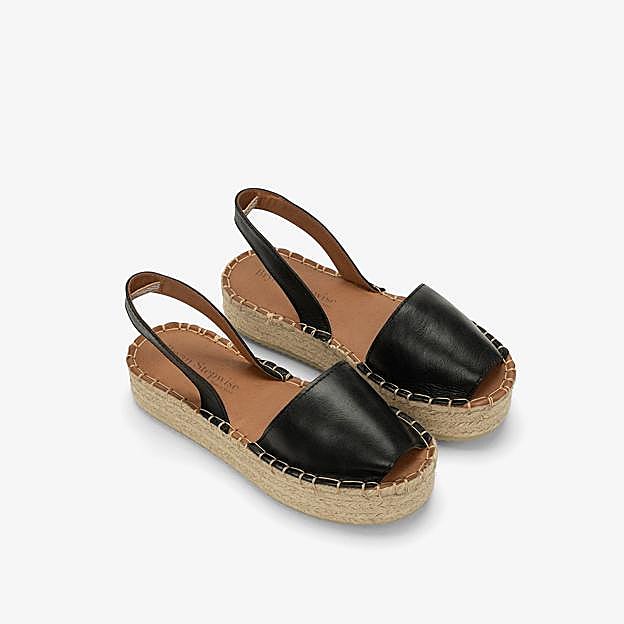 La marca Bryan Stepwise propone una versión de las abarcas igual de sofisticada y actual que la anterior con este modelo con plataforma en yute de 3,5 cm de alto y piel en color negro. Cuestan 50,90 euros.