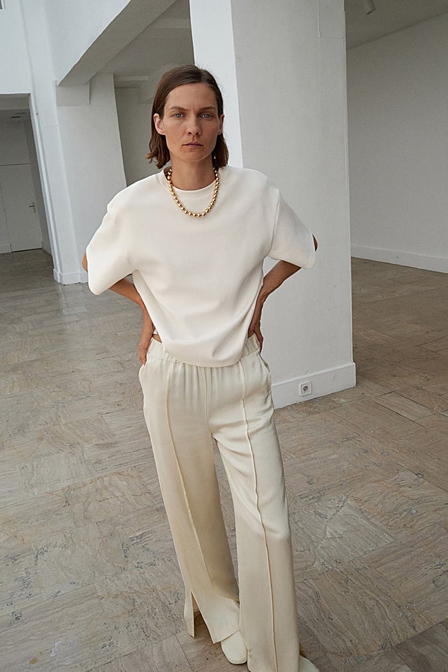 Si lo tuyo son los básicos, combina tus pantalones satinados favoritos con una camisa blanca o un jersey de punto en un color neutro, como el blanco o el beige. Si te animas con el look monocromático tendrás un look muy sofisticado. Infalible.