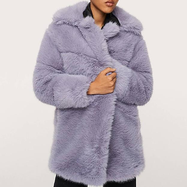 O, este espectacular abrigo de pelo oversize con cuello pico con solapa y bolsillos, en lavanda, por 99,99 euros.