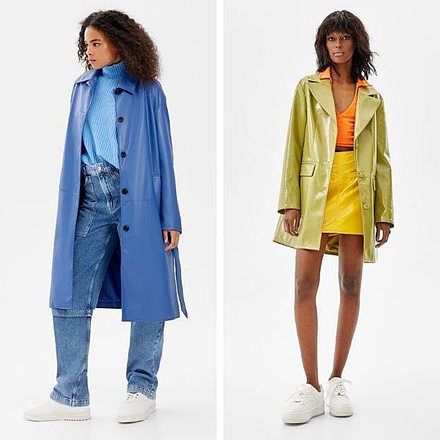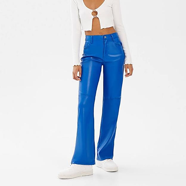 Bershka nos facilita el trabajo proponiendo los conjuntos perfectos para los anteriores abrigos. Combina el trench con unos pantalones straight efecto piel con talle alto, en el mismo azul, con un coste de solo 22,99 euros.