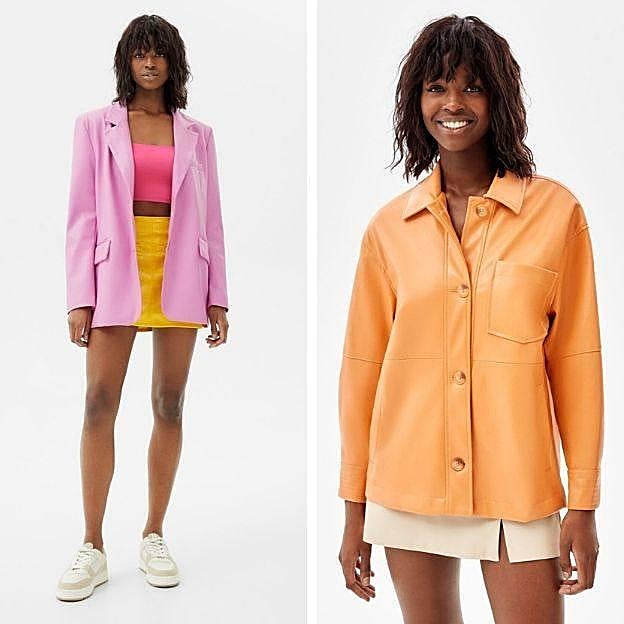 Una blazer efecto piel de corte masculino con hombros marcados, en rosa claro, por 35,99 euros. Y, una sobrecamisa de silueta relaja, efecto piel y con bolsillo de parche en el pecho, tono naranja, a 29,99 euros.