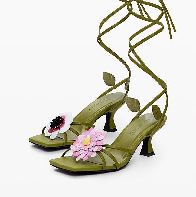 Si quieres ser la más original y que tus zapatos sean los protagonistas de tus looks de verano, tienes que hacerte con esta sandalia de tacón en tejido efecto piel de Desigual. Con cintas atadas al tobillo y aplique de flor 3D, están diseñadas por Tyler McGillivary. Precio: 199 euros.