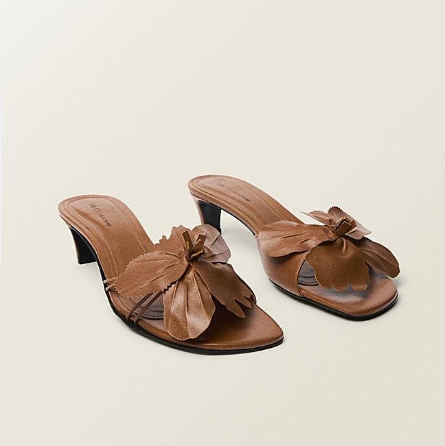 En las rebajas de Mango, hemos encontrado estos mules de color marrón que son perfectos para llevar a diario. Con tacón medio de 5m y confeccionadas en 100% piel bovino, llevan la flor en el centro. Precio: rebajadas a 65,99 euros.