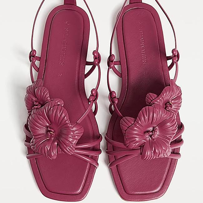 Estas de Stradivarius son unas sandalias planas con detalle de flores en empeine. Tiene tiras con nudos y cierre mediante tira atada al tobillo. Nos encanta su color fresa perfecto para verano. Precio: 29,99 euros.