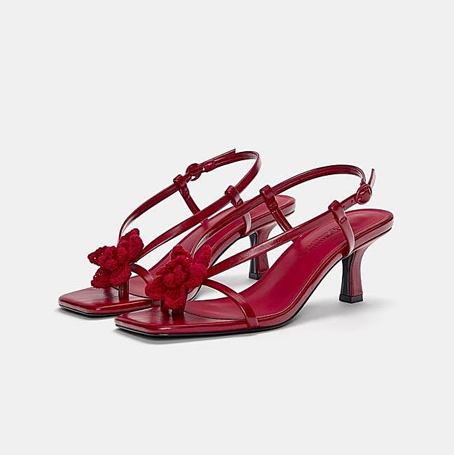Entre las opciones low cost, se encuentran estas sandalias de Pull&Bear de color rojo que no pueden ser más ideales. Con tiras finas, la flor pequeña en el empeine y un tacón kitten muy ponible, son ya de las favoritas. Precio: 29,99 euros.