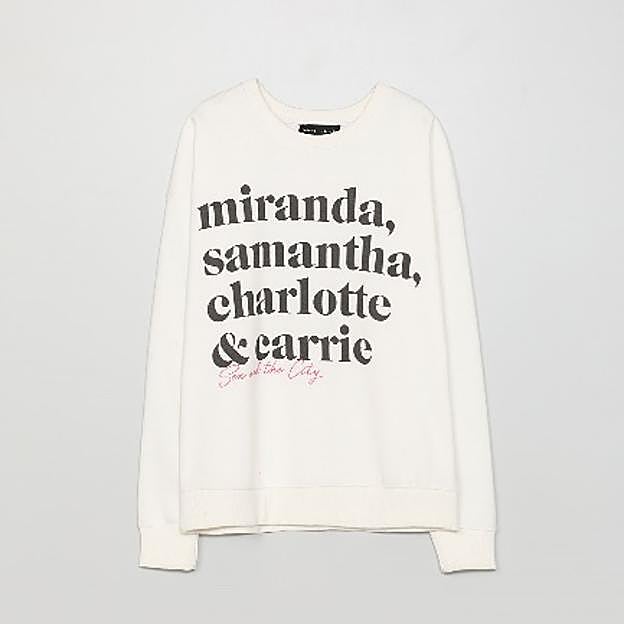 Nos encanta su toque retro y su diseño: es de color blanco, está confeccionada en una mezcla de algodón y el corte es holgado y oversize, por lo que sienta fenomenal a todas las figuras. En el lettering delantero aparecen los nombres de las cuatro protagonistas (Miranda, Samantha, Charlotte y Carrie) en color negro. Y en la espalda encontramos el mítico logo de la serie en color rosa chicle.