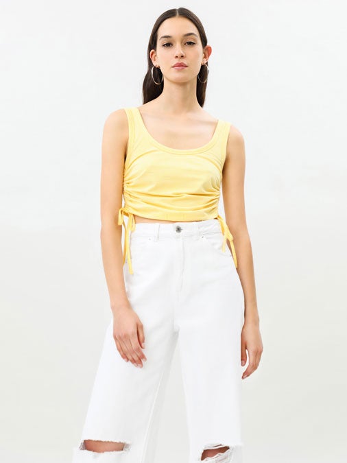 El principal valor de este bonito top son sus fruncidos laterales con lazada, que nos van a permitir hacerla más corta o más larga dependiendo de la prenda con la que lo combinemos.