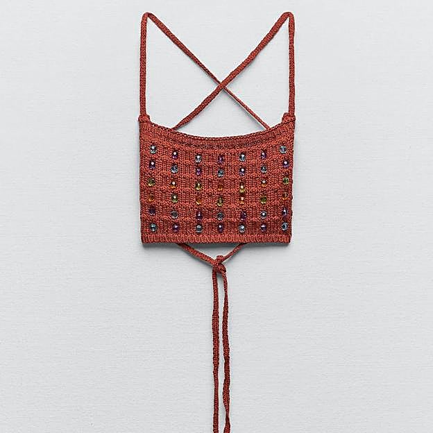 Hablamos de un top tipo bandeau de tejido de punto, en tono terracota. Es un diseño corto, con escote recto y ajustado a la figura. Tiene tirantes finos en el mismo material, que se cruzan en la espalda, quedando está abierta. Lo que lo hace especial e irresistible es la aplicación de abalorios de cristales multicolor en la parte delantera, en morado, azul, verde y naranja.