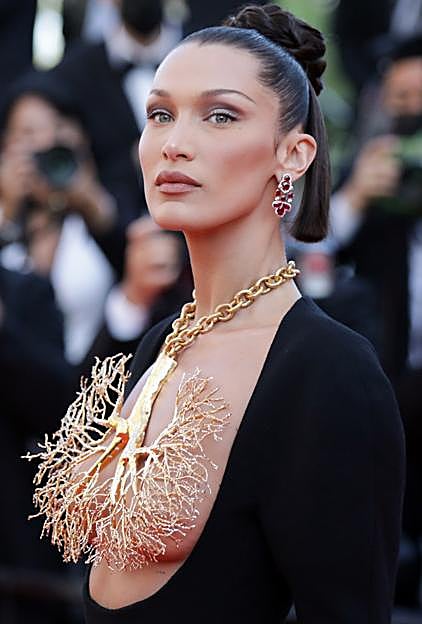 Bella Hadid se colocó entre las mejor vestidas de la alfombra roja del Festival de Cannes gracias a un vestido negro con un impresionante collar de latón dorado inspirado en los pulmones humanos del diseñador Daniel Roseberry para la colección de otoño de 2021 de Schiaparelli. Desde la firma describen esta impresionante pieza como «pulmones de trampantojo dorado con pedrería» y la modelo arrasó uniéndose a esta tendencia tan arriesgada.