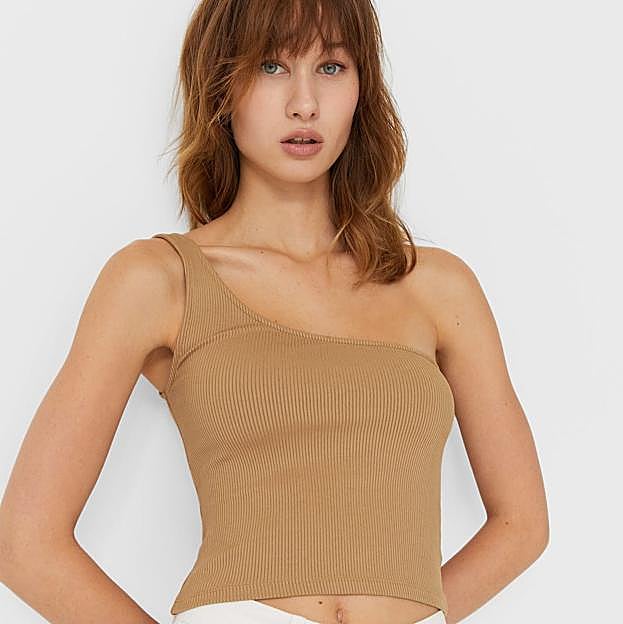 Si hay una propuesta favorecedora que está arrasando este es el top asimétrico, que viene con tirante medio en un lado y podemos encontrar en blanco, negro, beige y rojo. Cuesta 9,99 euros y en todas las tallas todavía está disponible entre las tallas XS y XL.