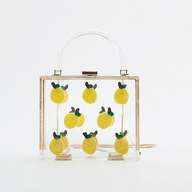 Y ya que estamos, redondea tu look con este bolso con formato caja de metacrilato transparente con estampado de limones (35,95 euros). Sus formas rectas le aportarán el toque elegante que precisa la ocasión, pero su desenfadado estampado le dará el toque juvenil que está pidiendo a gritos este vestido.
