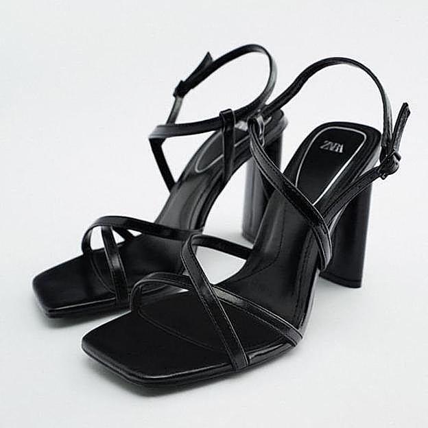La modelo de Zara lo combina con unas sandalias planas con un poco de plataforma, para usarlo en tu día a día, pero si quieres utilizarlo en tu próximo evento especial, combínalo con unas sandalias de tacón, como estas de tiras que también hemos encontrado en Zara (29,95 euros) y que quedan ideales con el vestido.