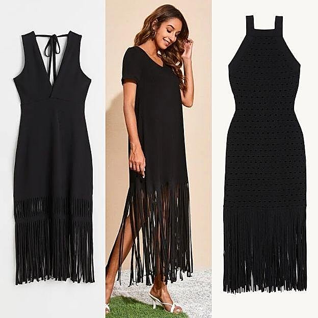Si te ha gustado mucho este detalle de los flecos en los vestidos, te sugerimos tres opciones de vestidos negros que cuentan con este toque tan especial en el bajo. Un vestido midi sin mangas con un diseño muy sencillo en la parte superior, y con flecos en el bajo de la cadena sueca H&M (24,99 euros). También otro vestido negro de flecos, muy parecido al de Zara, de Shein que cuesta 15 euros. Por último, para ocasiones más formales, nada como recurrir a la marca favorita de las francesas, Sandro. En su nueva colección tienen disponible este vestido negro de punto con flecos tan ideal, aunque algo menos asequible (245 euros).