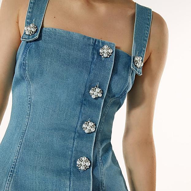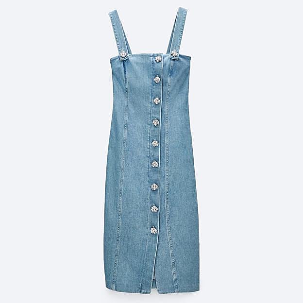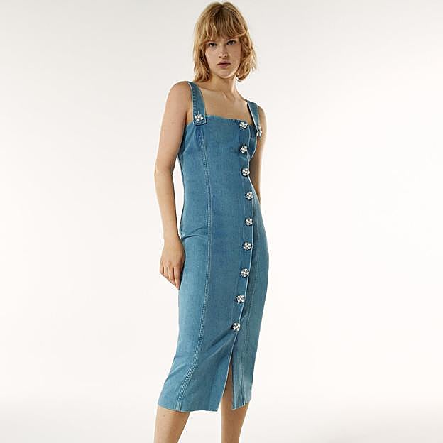 Este vestido denim con botón joya de Uterqüe tiene un precio de 89 euros y podremos encontrarlo en las tiendas y la web de la firma entre las tallas XS y L.