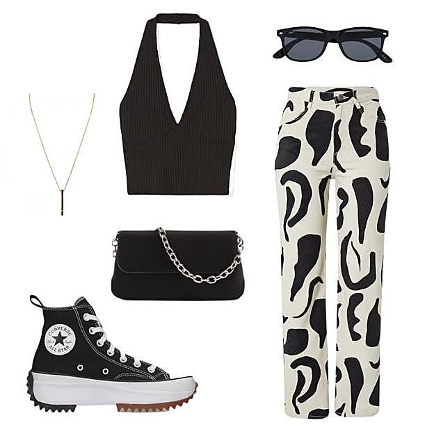 Apto para el día a día. El blanco y negro es un combo ideal para darle un aire más soft a tus looks. Es la propuesta que más se parece a la de María Pombo, y copiarla es muy fácil. Para ello, hemos escogido unos pantalones estampados de About You (29,99€), un top cogido al cuello con escote en V de Bershka (9,99€) y unas zapatillas de Converse (110€). Como complementos, hemos optado por un bolso con cadenas de Parfois (22,99€), una cadena dorada de Joys (10,99€) y unas gafas de sol negras de Ray Ban (29€).