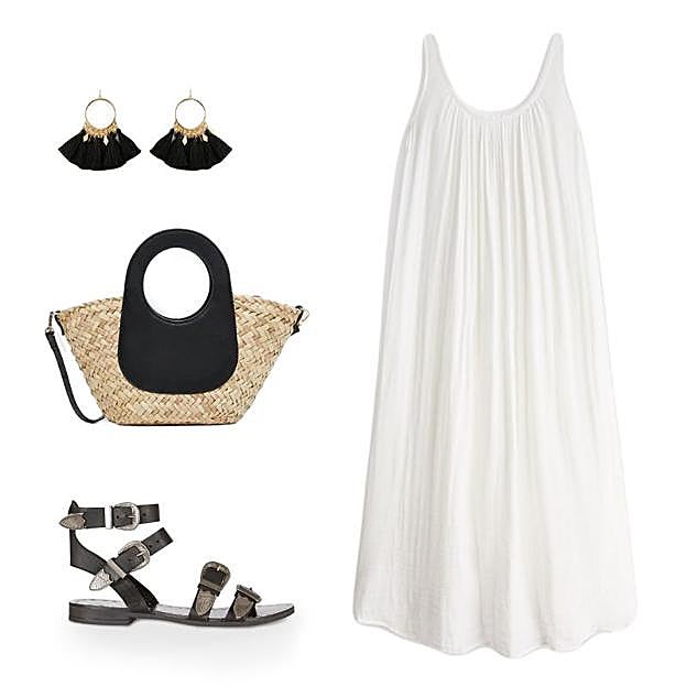 El estilo bohemio se lleva. Y más en verano. Prendas amplias y supercómodas que disimulan. Una opción es apostar por un vestido cómodo y amplio como este de Parfois (39,99€) y combinarlo con unas sandalias negras de tiras como estas de Ikks (115,90€). Dale un toque natural y bohemio con capazos tan bonitos como este de Mango (29,99€) y pendientes de flecos. Estos son de Women 's Secret (9,99€).