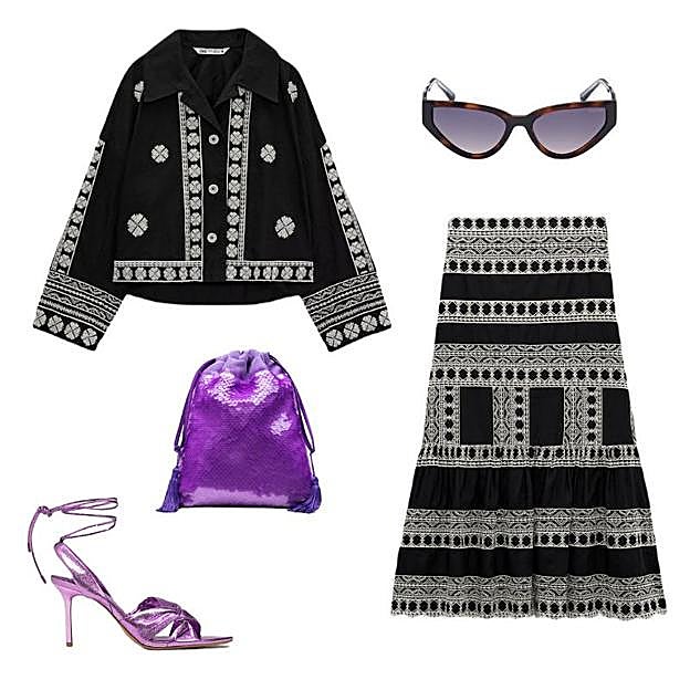Lleva dos tendencias en una. Aunque abogues por colores atemporales y que perduran temporada tras temporada, también puedes combinarlos con otros tonos más vibrantes y de moda. Lo bueno del blanco y negro es que aguanta todo lo que le echen. En este caso hemos combiando una falda (49,95 €) y una blusa bordada a juego (29,95 €) de Zara con unas sandalias de tiras de Stradivarius (35,99 €), un bolso saco súper especial de Laia Alen (65€) y unas gafas de sol de Guess (100€) de color lila. También puedes combinarla con rosas, azules, naranjas, lilas y, realmente, con el color que quieras.