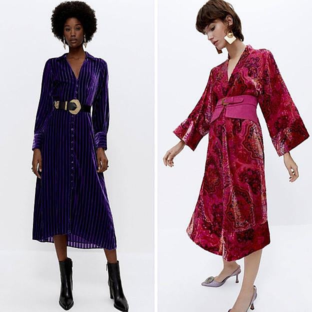 Adentrándonos en la elegancia en estado puro, tenemos los diseños de Uterqüe, tan versátil que los podemos usar para el día o la noche, ir al trabajo o acudir a eventos. Por ejemplo, un vestido camisero midi en tejido fluido devorado, con botones en la parte delantera y cinturón a conjunto (que puedes cambiar por uno negro y ancho con hebilla dorada para estilizar mejor la silueta, como propone la web), color morado, por 159 euros. Botas, botines, zapatos destalonados, merceditas, mocasines o deportivas, no importa con que te lo pongas porque sienta de miedo. La otra posibilidad no es un vestido, sino un caftán midi utilizado como tal, con estampado de fantasía bohemio, tipo paisley, y mangas tres cuartos amplias, en tonos fucsia, frambuesa o rojizos, a un precio de 99 euros.