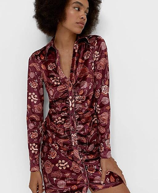 Stradivarius va a por el retro con un vestido camisero corto, con cuello solapa, manga larga, fruncidos a lo largo del cierre de botones, fit ajustado y estampado años 70, mezcla de flores y cachemira, en tonalidad granate, disponible por 25,99 euros. Póntelo con una chaqueta de borreguillo o aviador y botas altas planas en marrón.