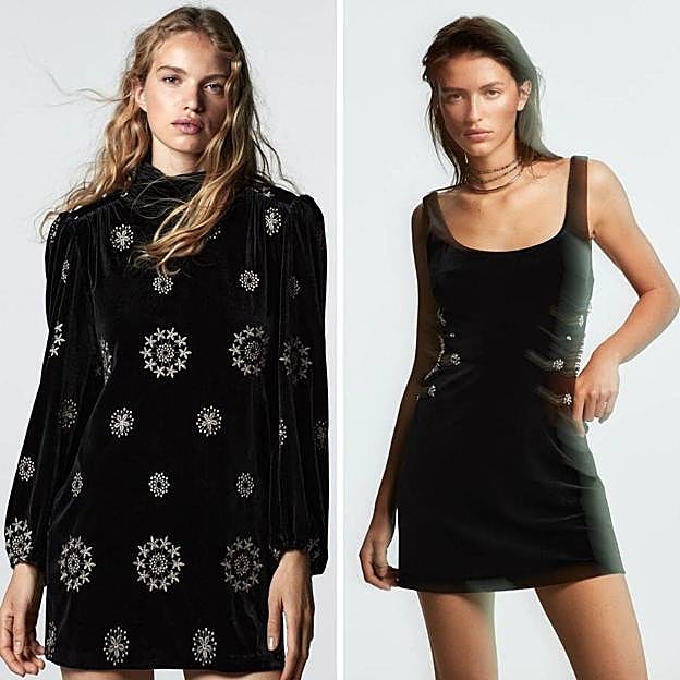 En la nueva colección de Zara, el terciopelo se adorna con detalles que tienen un 'leit motiv' de celebración puesto que la temporada de fiestas está próxima. Las dos propuestas son en color negro, mini y cuestan 49,95 euros, pero los diseños son muy diferentes. El primer vestido es un vestido es de cuello subido, fit fluido y mangas largas abullonadas, con bordados circulares a contraste, muy 60's. El segundo es de escote recto, tirantes anchos y tiene aberturas laterales o 'cut-out', con delicados apliques de joyas alrededor, para aumentar lo sofisticado de la prenda, que puedes llevar de noche con tacones o en la mañana, con botas altas o bonites militares.