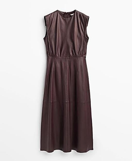 Se trata de un vestido de corte femenino y sofisticado reinventado en un acabado de tendencia: el 'leather effect'. Un diseño confeccionado en piel ovina en tono mezcla de marrón chocolate con burdeos y que está caracterizado por un corte evasé y un cuerpo con cuello redondo y sin mangas. Y, dado el tejido en el que está hecho, su precio no es del todo asequible: 299 euros.