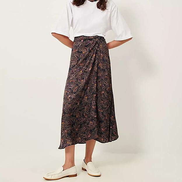 Esta es una falda midi recta de Sessùn confeccionada en satén fluido estampado, preparada en Italia y con un estampado exclusivo de la firma. Precio: 185 euros.