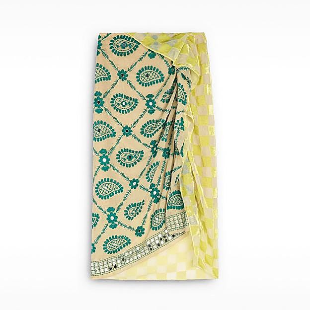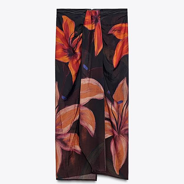 Falda pareo de Zara con tiro medio y el detalle de un nudo en el delantero. Lleva un estampado e flores de estilo tropical en tonalidades oscuras. Precio: 25,95 euros.