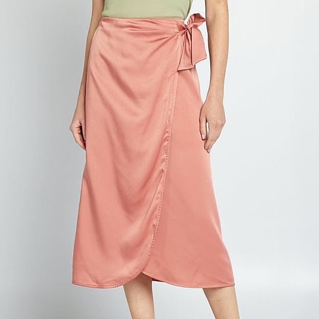 Falda midi satinada anudable de color rosa salmón de Kiabi. Esta prenda polivalente te permite mezclar estilos, ya sea para un día de oficina o para una noche especial. Precio: 20 euros.