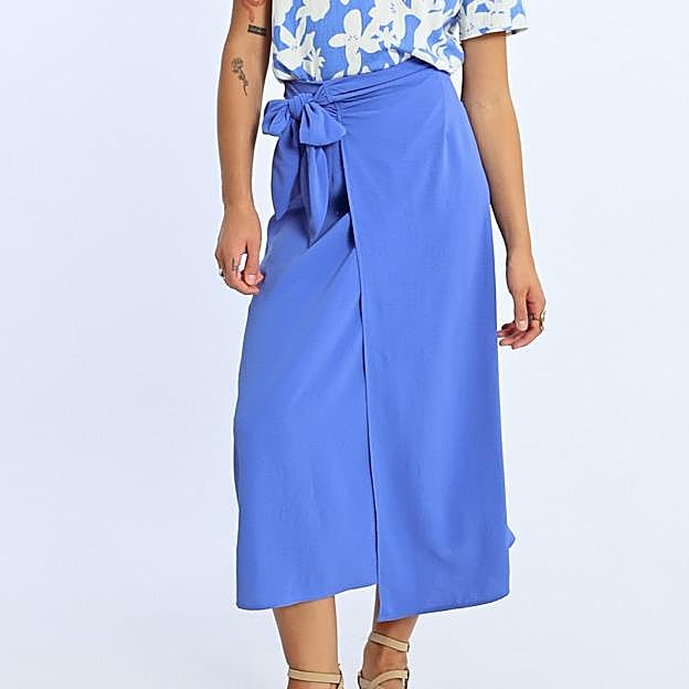 Esta alda midi, de tiro alto y corte recto es de Lili Sidonio. Es un modelo con cierre cruzado y lazada grande con un azul que sienta de maravilla. Precio: 30,80 euros.