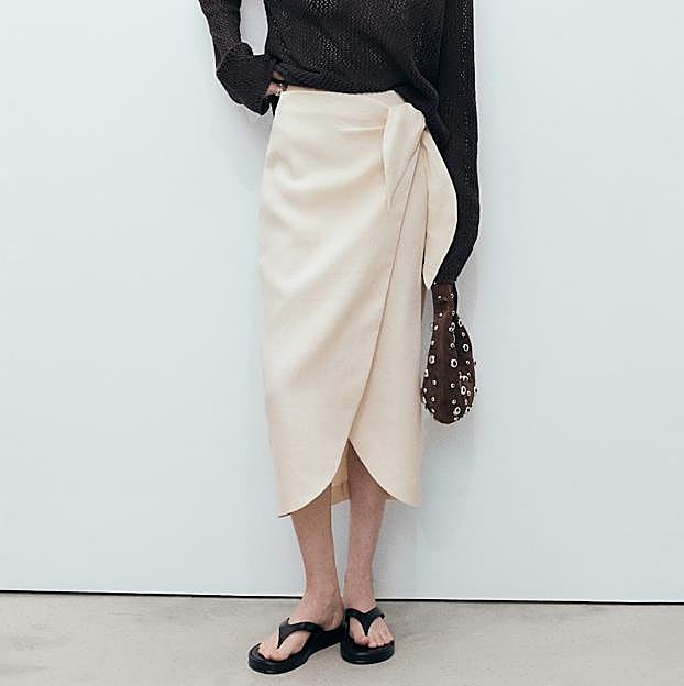 Falda de Mango confeccionada en un tejido 100% de lino. Es un diseño midi, recto y con el detalle de nudo en la cintura. Precio: 39,99 euros.