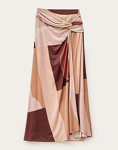 Falda con un estampado geométrico en tonos rosas y marrones de ba&sh. Tiene un diseño fluido y el detalle de un nudo en un lateral. Precio: 165 euros.