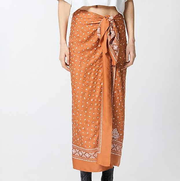 Falda de Pinko de largo midi con silueta de pareo confeccionada en ligera sarga de viscosa que está adornada con un estampado aplicado con patrón de bandana. Precio: 295 euros.