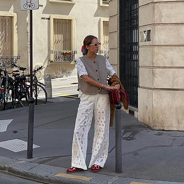 Otra de las tendencias de la temporada son los pantalones de encaje. Aunque no todas se hayan atrevido con ellos por lo particular de su diseño, esta prenda tiene muchísimas posibilidades. No hay más que ver lo bien que combina con las zapatillas de colores. Ambas piezas juntas crean un look casual ideal para llevar a diario en la ciudad o para incluir en tu equipaje de estas vacaciones si quieres marcar la diferencia con tus estilismos.