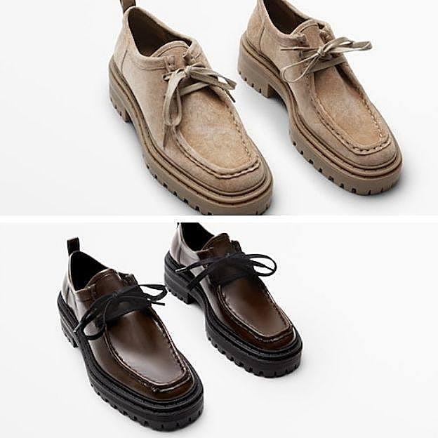 Massimo Dutti puede presumir de dos elegantísimos diseños, muy a la moda. El primero, un zapato plano de serraje con cordones a tono y suela track, en tono arena, por 89,95 euros, especialmente bonitos si se combinan con un vestido de punto neutro. Y, un diseño masculino con bordón y suela gruesa dentada, en marrón chocolate y negro, al mismo precio que el anterior, geniales para la oficina, ya sea con vaqueros o pantalón de traje.