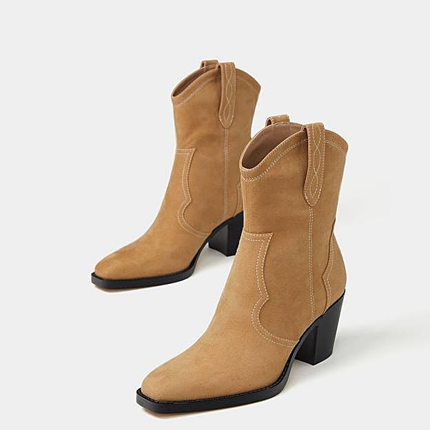 Y, por último, si vas más con las estéticas hippies, setenteras y el boho chic, este será tu zapato favorito para llevar con maxi vestidos, un total look denim o pantalones acampanados con blusas de estampado étnico o pasiley. Hablamos de estos botines estilo cowboy con tejido tipo serraje, detalles de costuras decorativas, tiradores a los laterales y tacón ancho a contraste, color arena, por 32,99 euros.