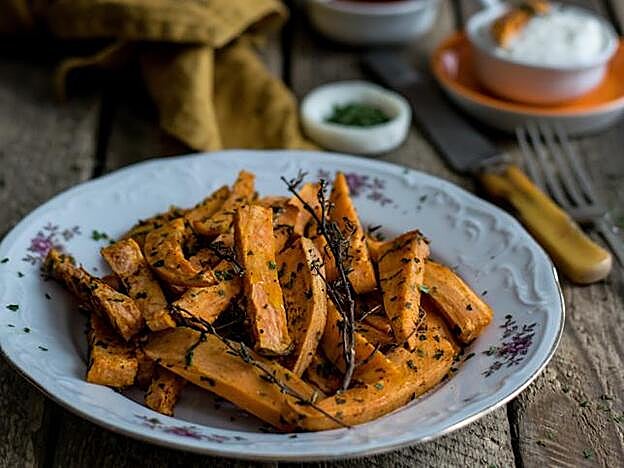 La batata cuenta con un índice glucémico mucho menor que la patata. Las patatas al horno o las patatas fritas tienen un índice glucémico de 95 (IG 95) frente al IG 50 que tienen las batatas o boniatos. La diferencia, como veis, es para tenerla muy en cuenta. Apréndete esta frase como si fuera un mantra: ‘Los niveles de azúcar en sangre bajos evitan la acumulación de grasa abdominal’ y pásate a la batata.