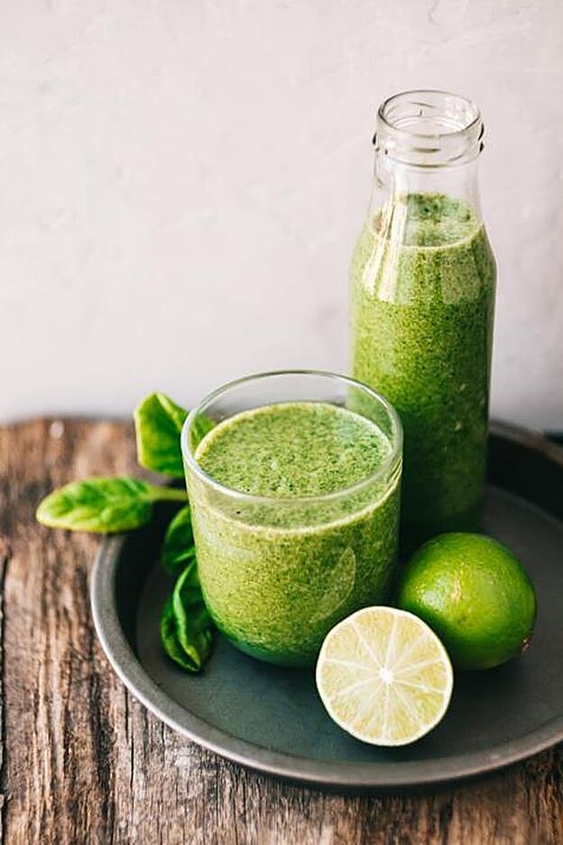 Las espinacas son uno de los alimentos que no deberían nunca faltar en tu dieta saludable y la mejor manera de tomar una buena cantidad de ellas y en crudo son los batidos. Las espinacas son ricas en betacarotenos pero también en ácido fólico y potasio. Un cóctel antioxidante muy saludable que aliñado con zumo de lima potencia aún más sus propiedades antiage.