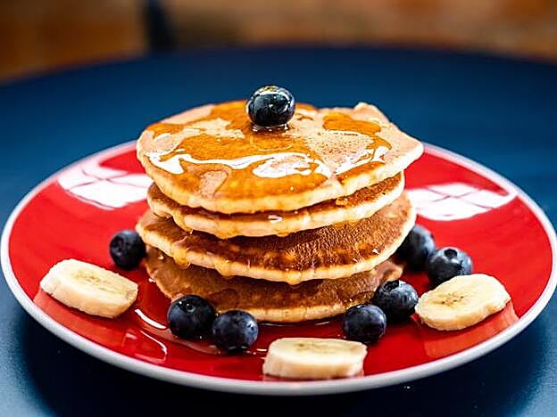 7. Sirve las tortitas con un poco de yogur natural y frutas como fresas, rodajas de plátanos o arándanos.