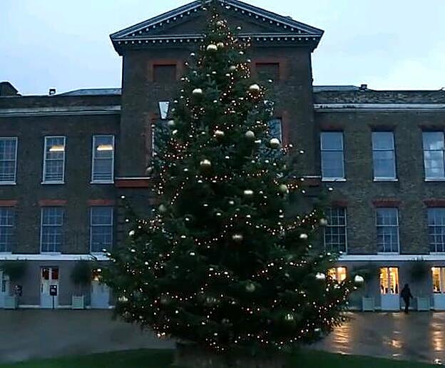 En la entrada principal del Palacio de Kensington se ha colocado un gran abeto de treinta pies de altura (casi 10 metros) que, quizá inspirado por el estilo clásico pero con toques de tendencia de Kate Middleton y Meghan Markle, se ha decorado siguiendo una tendencia muy minimalista en la que, sin embargo, los brillos del dorado son los protagonistas.