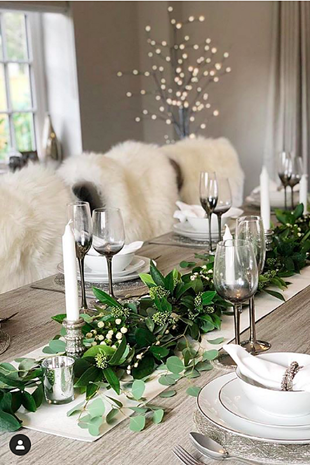 Este es otro camino de mesa que puedes hacer para darle un toque especial y elegante a tu mesa de Navidad dándole protagonismo al verde con plantas ornamentales. Puedes elegir en tu floristería plantas como eucalipto, helecho, aspidistra o ruscus, follaje que se suele poner para acompañar un ramo de flores y darle más cuerpo. Son plantas que hacen un efecto muy chic en la mesa. Si le añades además muérdago, con sus pequeñas bayas blancas, el efecto es todavía más sofisticado y festivo. ¡Très chic!