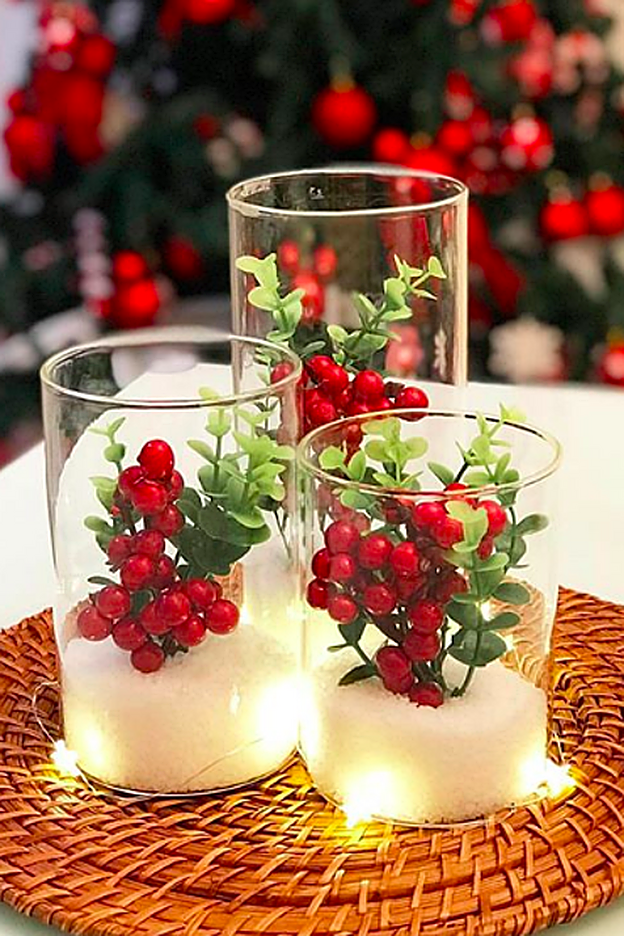 Son facilísimos de hacer y quedan preciosos como centro de mesa. Solo tienes que emplear tres tarros de vidrio o cristal, incluso vasos anchos, y ponerles en el fondo una cama gruesa de sal gorda. A continuación pincha sobre la sal ramitas de rusco, espino de fuego o acebo, incluso sus versiones de pega que puedes encontrar fácilmente aunque siempre queda más bonito utilizar elementos naturales. Ponles debajo un salvamanteles de mimbre o de un material similar, incluso un plato, y rodea los tarros con unas pequeñas luces led. No puede ser más fácil y más resultan la idea.