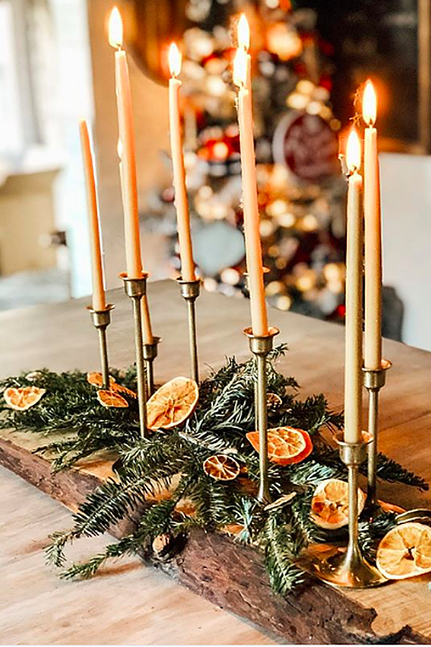 ¿Qué te parecería crear tu propio camino de mesa aromático? Nos ha encantado la idea de combinar ramas de pino con rodajas de naranja seca. Puedes utilizar un camino de mesa que ya tengas como base o crear uno con una tabla de madera o con tela de arpillera por ejemplo que es baratísima y queda fenomenal. Deja secar rodajas de naranja unos días antes de tu comida o cena de Navidad y recoge ramas de pino. Intercala en tu camino de mesa los dos elementos y pon varias velas para completar tu precioso centro de mesa que además tendrá un aroma delicioso.