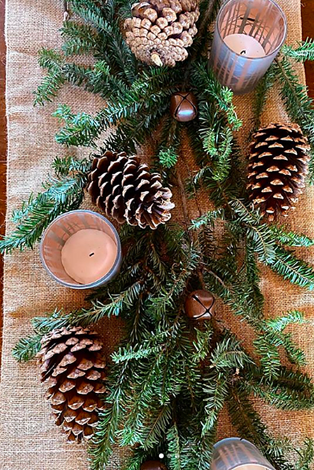 Qué ambiente más bonito crean siempre las decoraciones con piñas. Nos encanta la calidez que aportan y lo divertido que es ir en busca y captura por el bosque de las mejores piñas para hacer decoraciones. Combina en un camino de mesa, de arpillera o tela de saco, piñas, ramas de pino y algunas velas flotantes en vasos y ya tendrás listo el toque mágico navideño por poquísimo dinero y sin apenas trabajo. Si quieres darle un aire más sofisticado a la mesa solo tienes que pintar tus piñas de plateado o dorado, el efecto es precioso.